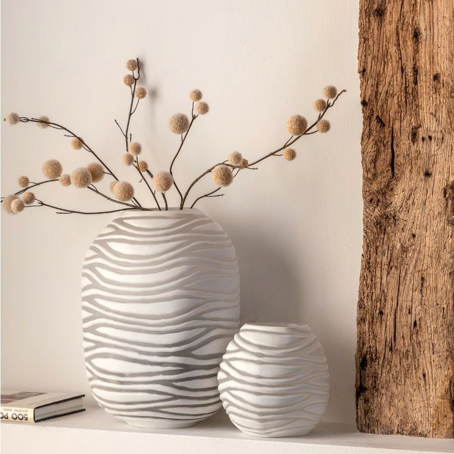 Crafted with intricate detail, this heavyweight handblown white glass vase is transformed when placed against a window or other light source, revealing its delicate beauty. The freeform stripes, hand-carved with precision, and organic shape imbue a sense of nature, making it a truly elegant addition to any room.